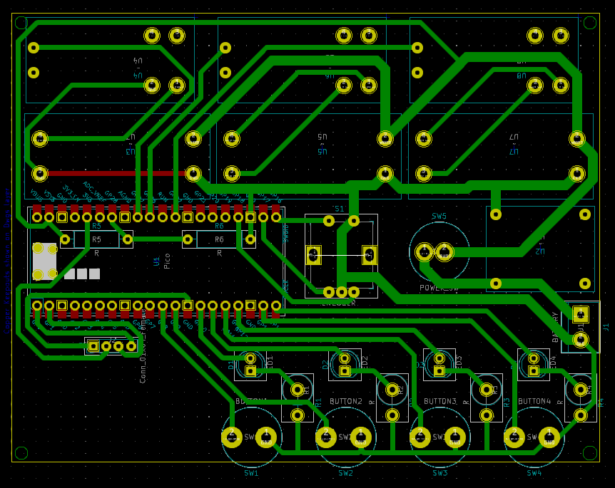 The electronics are made with a Raspberry Pi Pico (or Pico W in this case, although WiFi or BT are not used yet). This keeps the future option of a USB Midi input open. The user interface consists of four buttons, each with an LED above, and a clickable rotary encoder, as well as a power switch and an 128x64 SSD1306 OLED display. To drive the solenoids, three step-up converters create ~16V from the single Li-Ion 18650 cell. Their output is then switched to the solenoids using MOSFETs. A small TP4056 module handles recharging the battery.