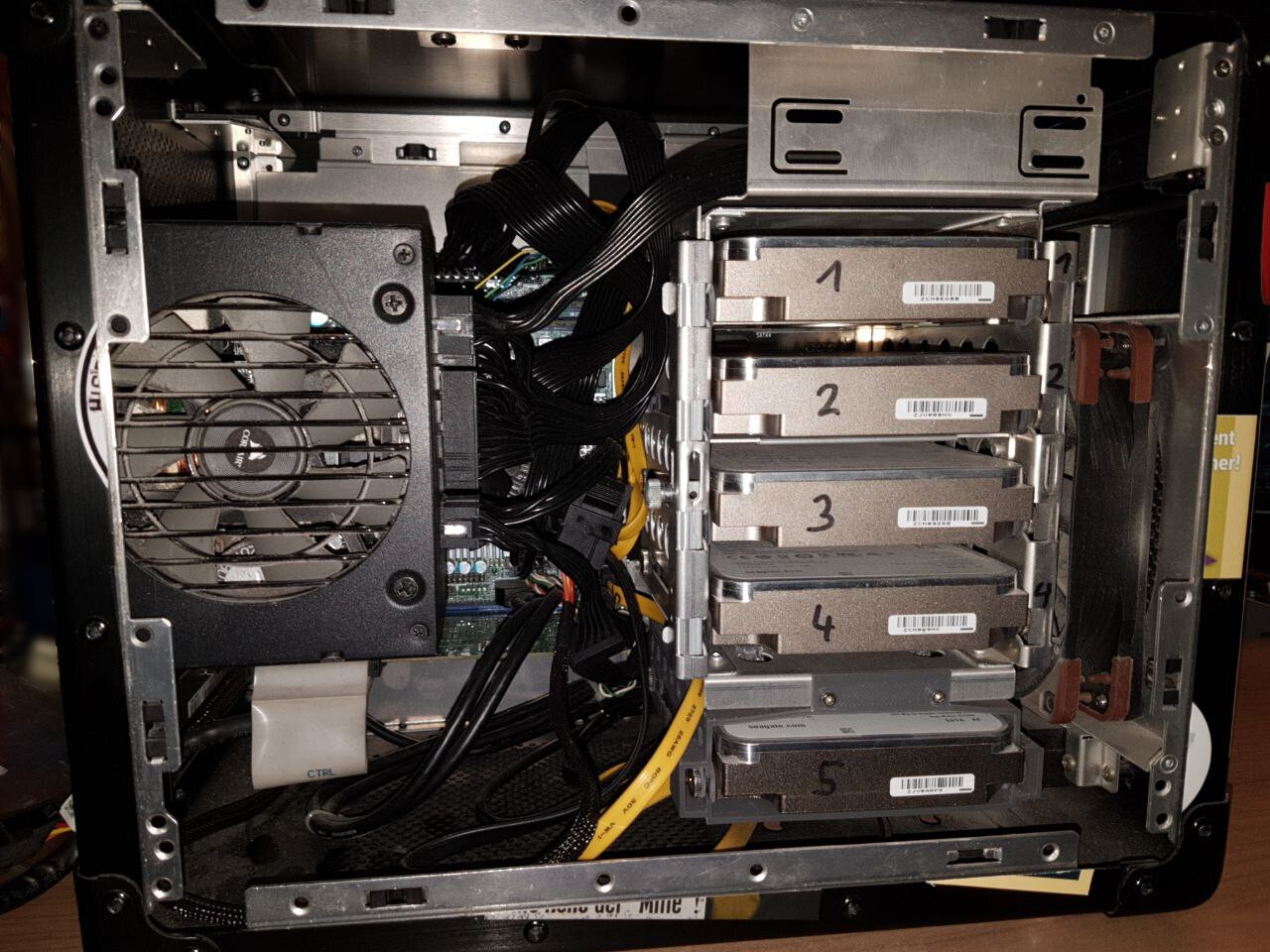 One thing I'm not quite happy with is the airflow inside the case. The front fits a 140mm fan that directly hits the disks. Nonetheless the temperature of the disks is just below 50°C, which is a bit high for my liking. Sometime in the future, I want to replace the case with a full-size ATX one with easier accessible drive bays and more space for fans and cable routing.