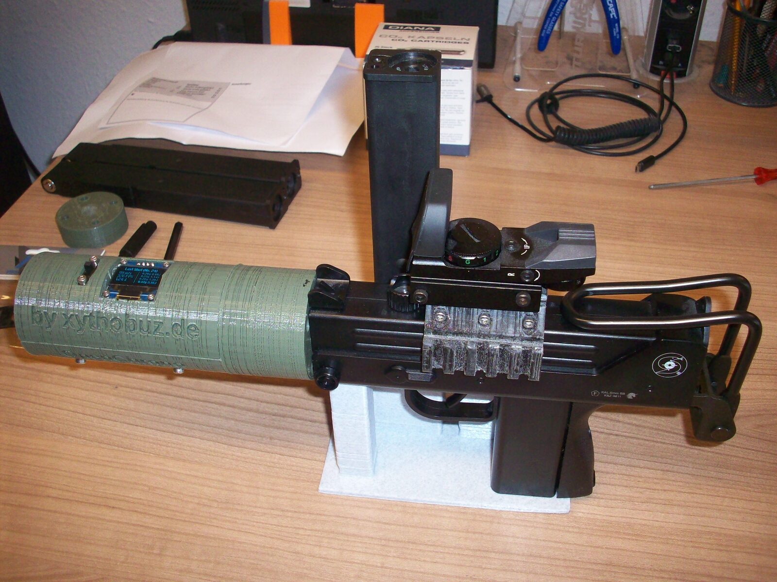 The first gun I wanted to test with is a full-metal TM 1911 clone with a gas blowback system. The repetition imparts a big impulse on any barrel attachment, big enough to break my self-made silencer adapters in the past after a single-digit number of shots. Of course OpenChrono is much heavier than a plastic silencer imitation, so predictably it broke after only three test shots, even though I supported the weight with my hand. Additionally the impulse in combination with the inertia of the AA batteries caused the supply voltage to cut out in the moment of shooting. So no usable measurements could be obtained.