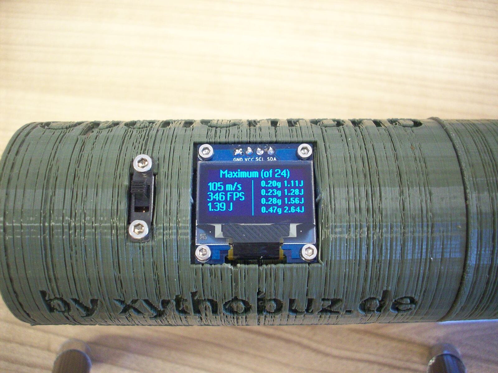 Of course it didn't take much time for me to get some ideas on how to combine this with my other interests. So I decided to build a chronograph that can measure the speed and energy of BBs shot out of an Airsoft gun. Two infrared light-barriers detect when a BB passes so an Arduino can measure the speed and display it on an OLED display.