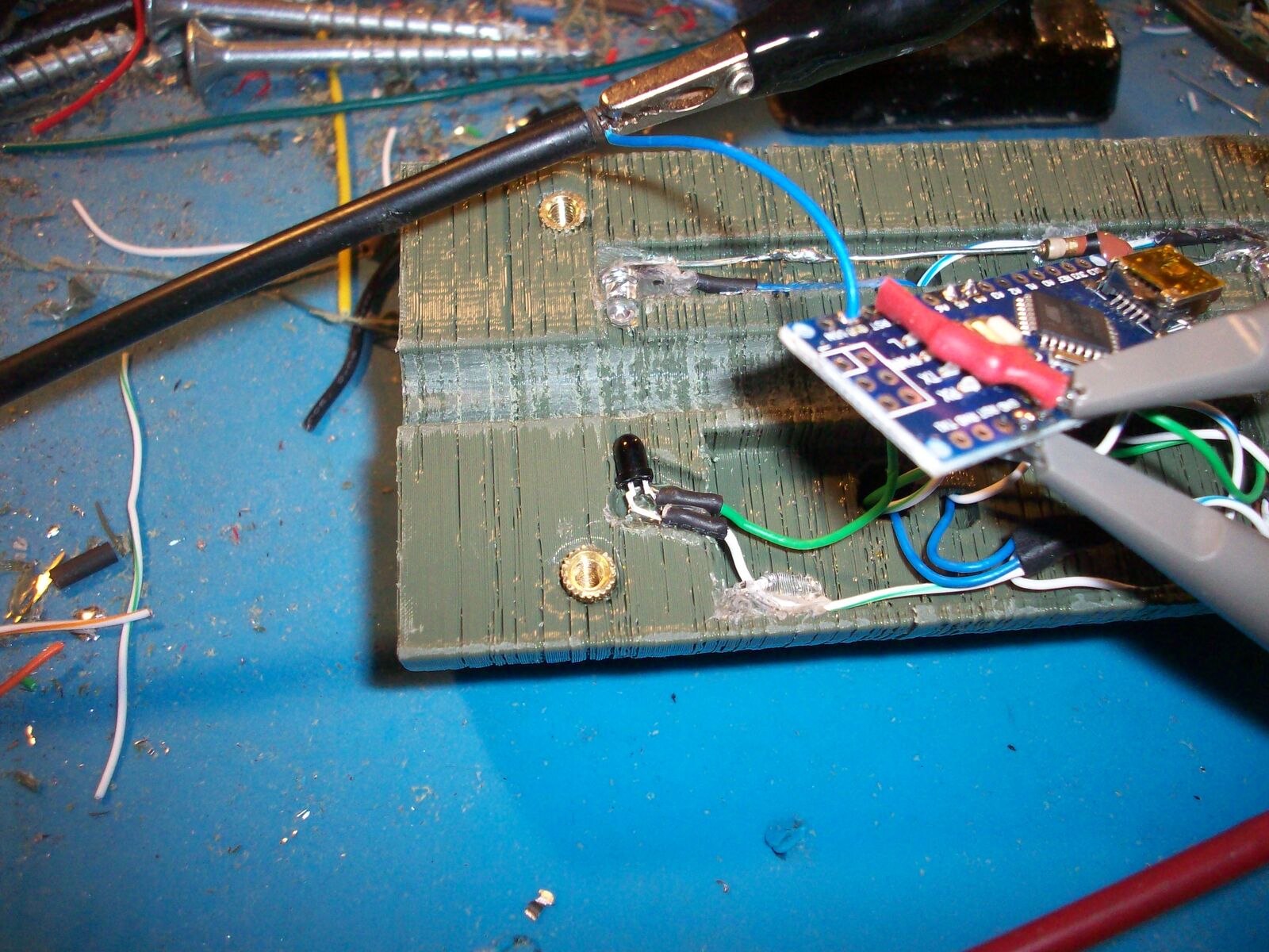Do the same for the phototransistors. I recommend connecting both of their Emitters, as well as all the other Ground connections (battery, OLED display, phototransistors, LEDs) together in one spot, wrapping their connection point in heat-shrink tubing. For the pull-up resistors of the phototransistors, I soldered them on top over the Arduino to the +5V pad, with heat-shrink tubing to prevent any shorts. I think this is the most space efficient solution.